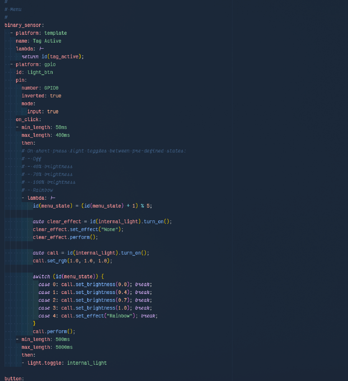 But what should happen if someone clicks the button? If it’s a short click, light should toggle between a few brightness settings and everyone’s beloved Rainbow effect.