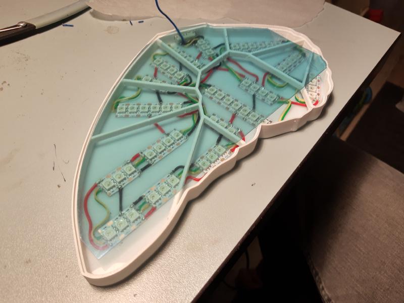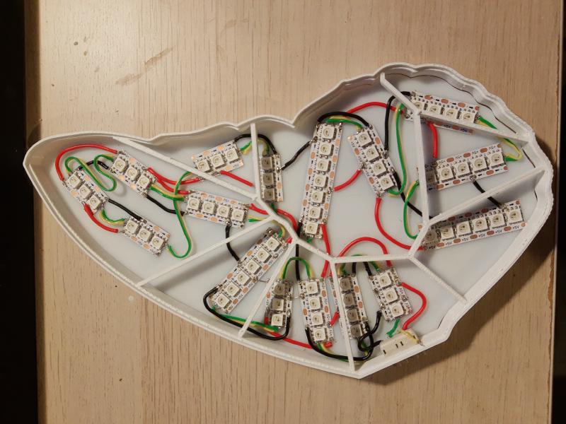I ended up placing 65 LEDs per wing, and frankly, I overdid it. Whole thing would still work with half the amount of LEDs. Oh well.