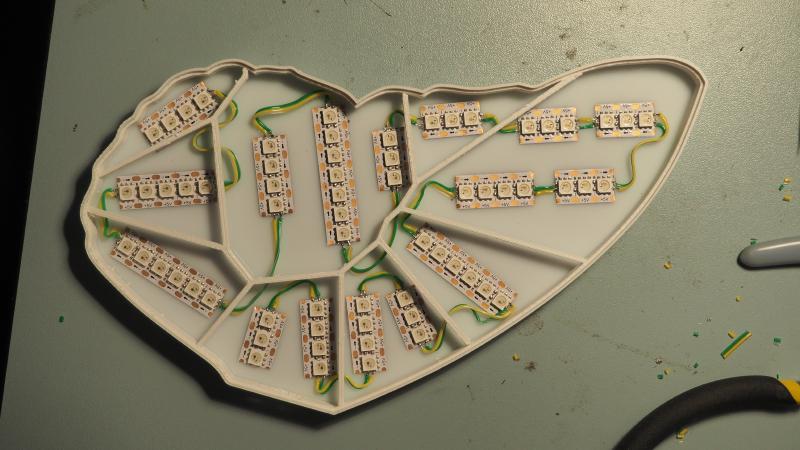 I ended up placing 65 LEDs per wing, and frankly, I overdid it. Whole thing would still work with half the amount of LEDs. Oh well.